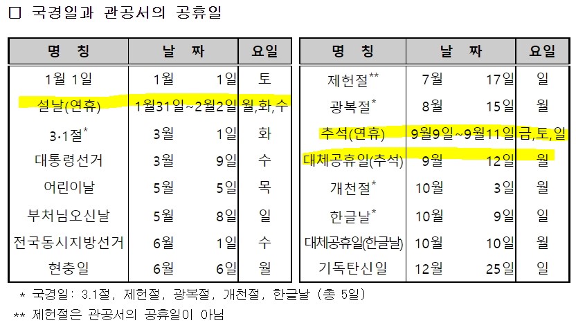 1월 29일(토)~2월2일(수) 구정 설날 - 주말까지 포함하면 총 5일 휴일이네요.