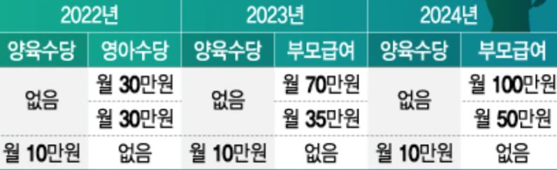 2022년 영아수당 월 30만원에서 2023년 월 70만원, 2024년 월 100만원까지 지원금은 매년 증가된다고 하니 참고바랍니다.