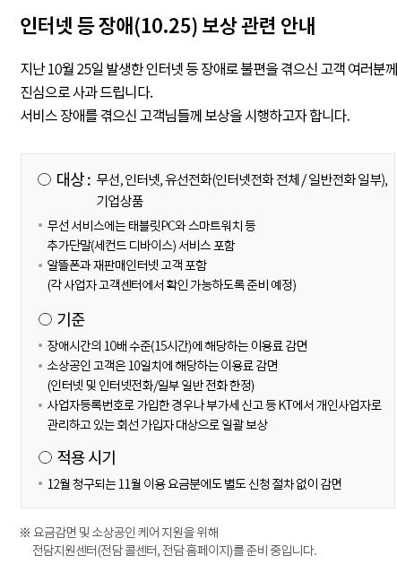 피해 보상은 별도 신청 없이 12월 청구되는 11월 이용 요금에 보상금액을 일괄 감면 받게 됩니다. 개별 문의와 신청의 번거로움을 최소화하고 보상에서 누락되는 일이 없도록 일괄 보상하기로 한 KT의 빠른 의사결정에 박수를 보내고 싶습니다.
