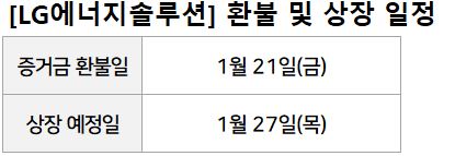 LG엔솔 증거금은 1월 21일(금) 환불되고, 상장은 1월 27일(목)입니다.