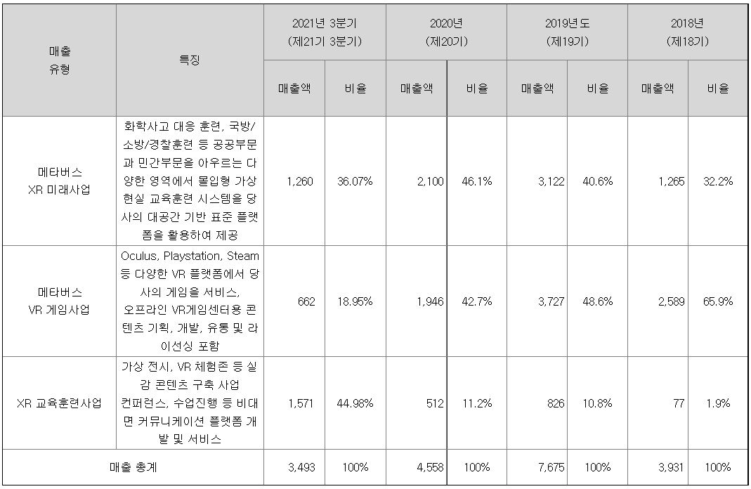 하지만 국내 유일하게 다수 인원이 동시에 가상현실 훈련에 참여할 수 있는 '대공간 XR 워킹 시스템' 등 핵심 기술을 보유하며 자체 기술력으로 기술 특례 상장에 성공하며 다른 메타버스 기업은 자이언트스텝, 맥스트와 비교되고 있습니다.