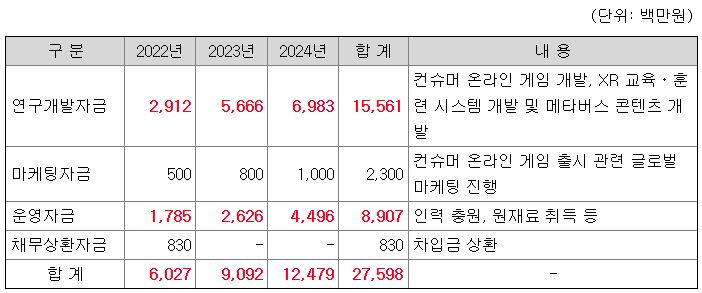 스코텍엔터테인먼트는 이번 코스닥시장 IPO 공모를 통해 총 222만 6300주를 공모합니다. 상장공모를 통해 조달된 공모자금은 컨슈머 온라인 게임 개발 및 XR 교육·훈련 시스템과 메타버스 콘텐츠 개발 등의 연구개발(R&D)과 원재료 취득 등 운영자금으로 활용한다는 방침입니다.