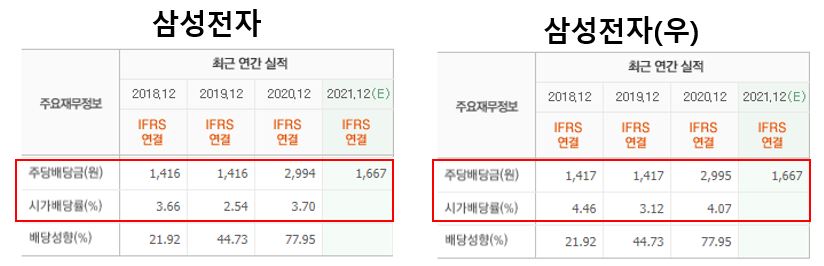삼성전자 vs 삼성전자우 배당금 비교