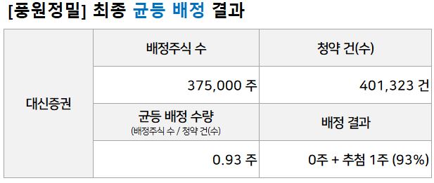 풍원정밀 균등배정 결과